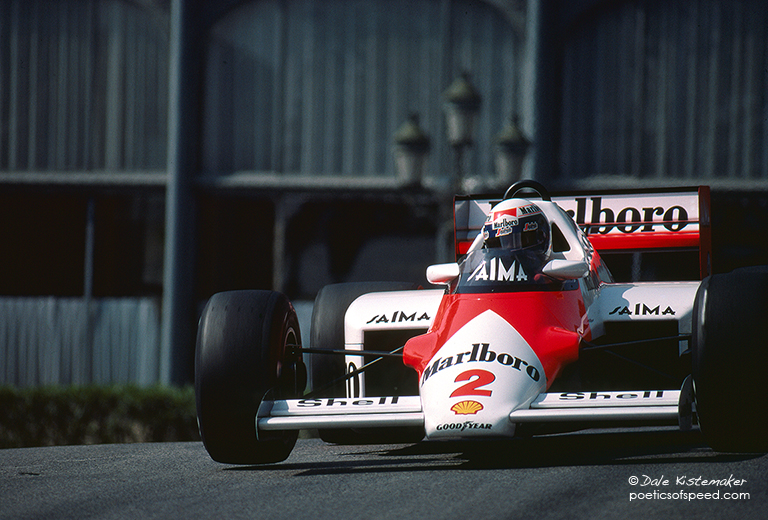 Nicknamed “the professor” for his smooth, precise, intellectual driving, Alain Prost won four World Championships. A Formula One racecar has an incredibly stiff chassis, sophisticated suspension and aerodynamic downforce designed to keep all four tires glued to the track. As Prost’s McLaren screams through the Casino turn at the Monaco Grand Prix the inside front wheel lifts. This is a rare moment and reveals he was driving the car at its absolute limit.