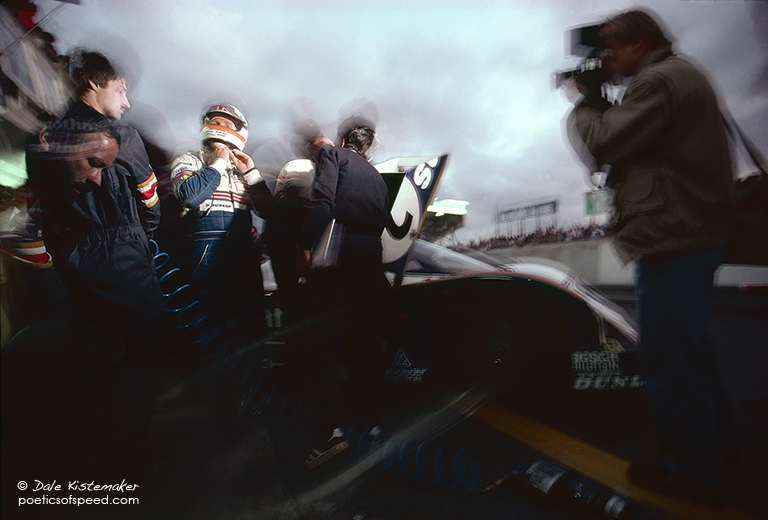 Surrounded by the activity of the pit crew the driver fastens his helmet. Every movement results in a fusillade of strobe and video lights.