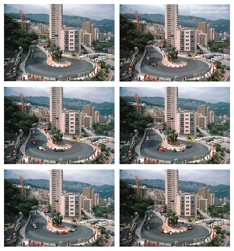 At the Loew’s Harpin, Senna leads the first lap, 1985.