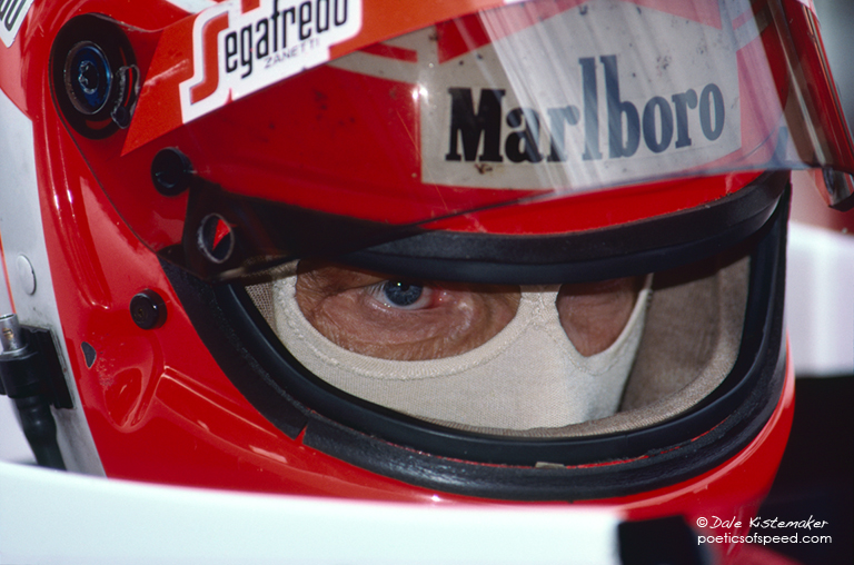 Every driver I spoke with said concentration was the most important skill in racing. Each had developed techniques to shut out all distractions, often describing it as a switch that was flipped in the mind. Frequently putting on the fireproof balaclava and helmet was the act that changed them into the focussed, single purpose racer. Repeatedly I saw the transformation taking place and in no one more clearly than Niki Lauda.