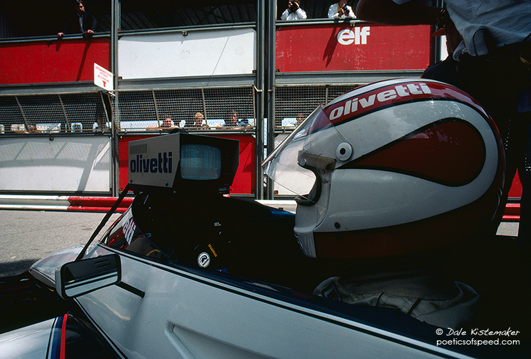 Drivers have a curious way of talking about time. They are always losing it or finding it, often in incredibly small increments. Most say they can “feel” a difference of a tenth of a second. With the use of a small CRT monitor on a cable connected directly to the official track timing the driver can now see immediate classification and times to one thousandth of a second. Nelson Piquet sits in the Brabham cockpit studying the data.