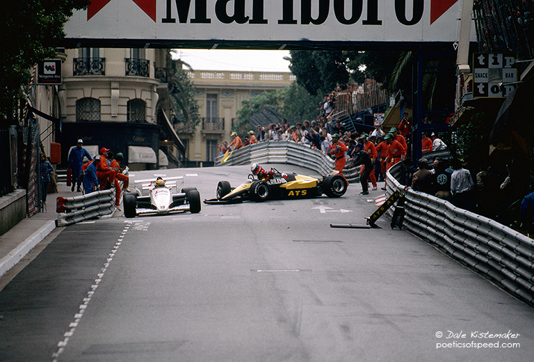 Manfred Winklehock in his ATS-BMW has hit the armco barrier near the legendary Tip Top bar. Ayrton Senna squeezes through the narrow opening in his Toleman-Hart.
