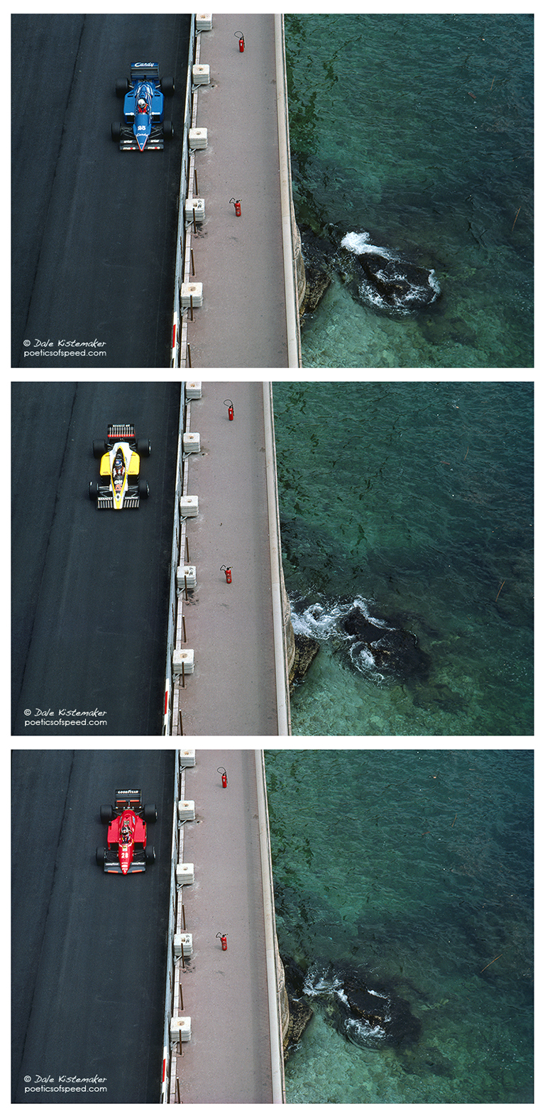 After Portier a Ligier, a Renault and a Ferrari accelerate along the Harbor and into the Tunnel.