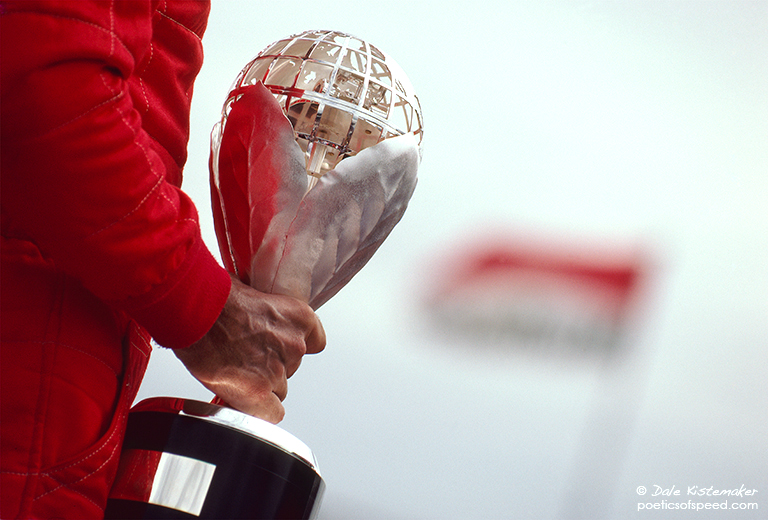 On The Podium – Alain Prost Holds The First Place Trophy – British GP 1985