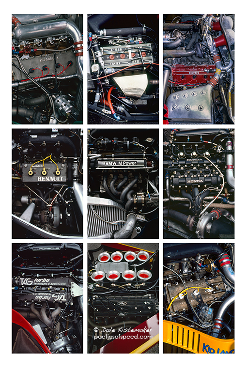 I appreciate all the responses to the recent posts on my Dale Kistemaker Facebook page of my F1 turbo era engine pictures. I’ve recently produced a new collector series 24” X 36” photograph with a grid of nine images of these mechanical masterpieces.