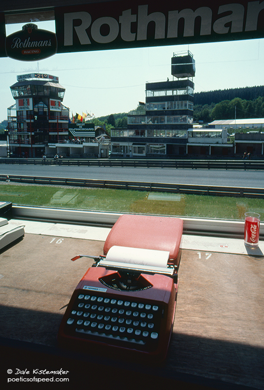Press Box With Unused Typewriter And Blank Paper – 1985 Belgian Grand Prix, cancelled because the new track surface could not survive the powerful F1 Turbo Cars.