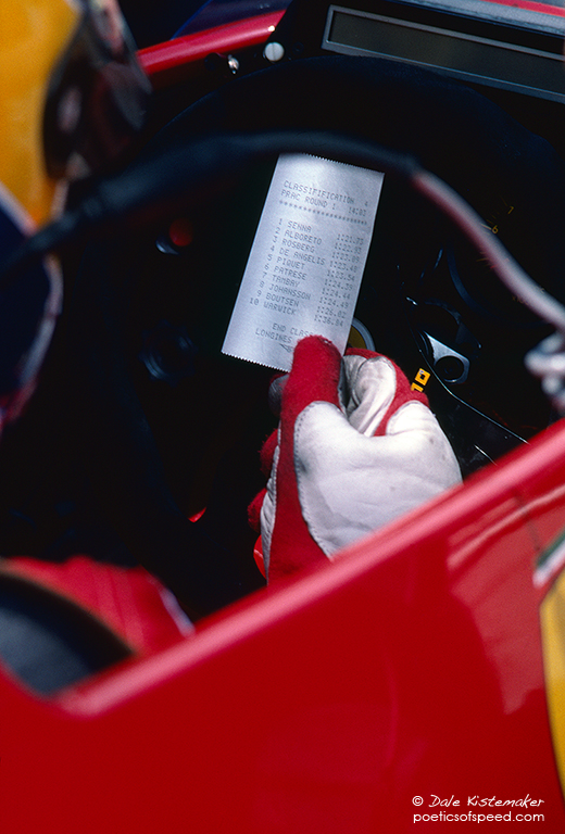 Michele Alboreto checks practice results. This thermal print shows classification and times to a hundredth of a second.