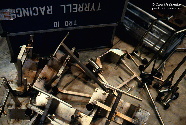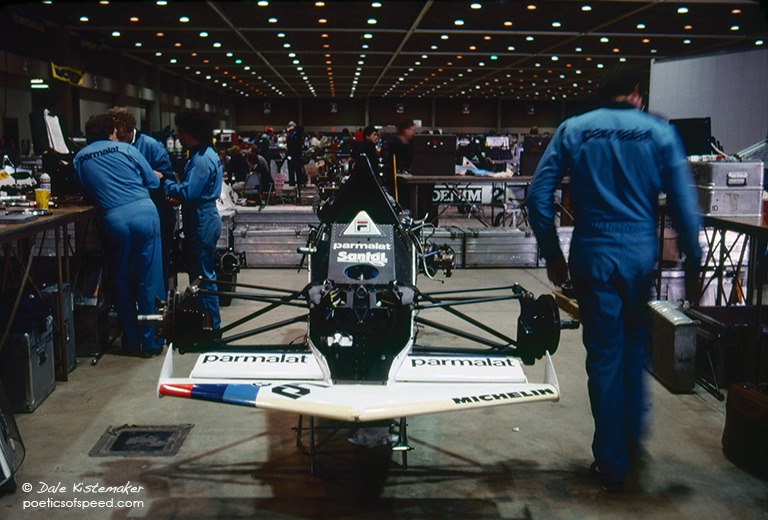 This is a second BT52 chassis under construction. Note the different wing and chassis graphics. More suspension parts and a stack of rear wings have been unpacked. The previous image was one of the few I shot on Kodachrome, this picture is on Ektachrome slide film. The two photographs were shot at different times of day and the 5000˚K daylight coming from the open garage door behind me affects the color balance. The Kodachrome 64 was a lower ASA film necessitating a slow shutter speed and wider lens aperture. The Ektachrome 400 was faster and enabled a higher shutter speed and smaller aperture that resulted in stopped action and greater depth of field.